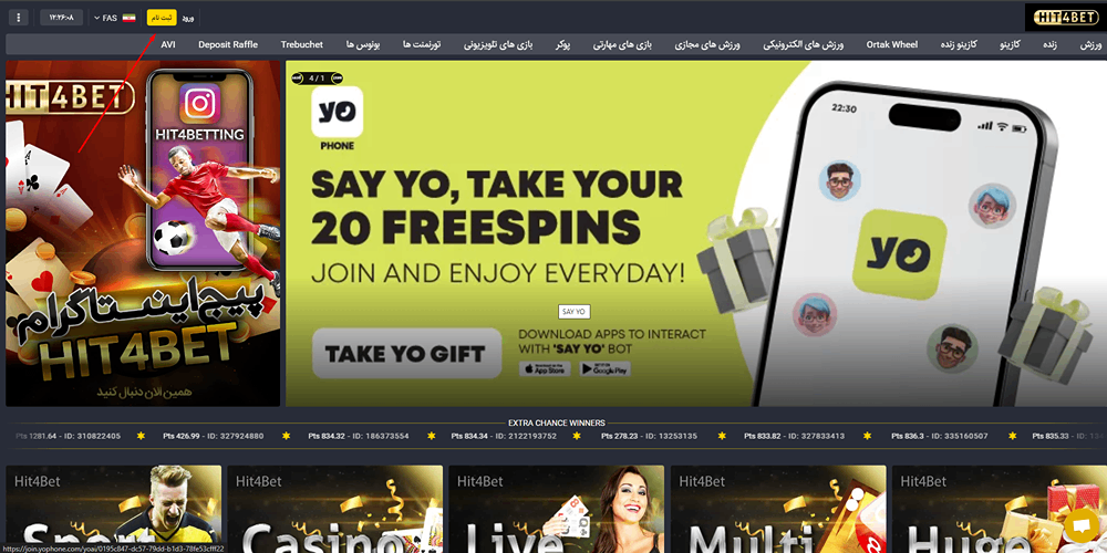 ثبت نام ساده و سریع است: از آدرس بدون فیلتر (مانند hit4betiran.com) وارد شوید، روی دکمه “ثبت نام” کلیک کنید، اطلاعات پایه مانند نام کاربری، رمز عبور، ایمیل و شماره موبایل را وارد نمایید، قوانین را تأیید کنید و ایمیل تأیید را چک کنید. بدون احراز هویت پیچیده، در کمتر از ۲ دقیقه حساب فعال می شود و بونوس ۱۰۰% شارژ اولیه دریافت می کنید.